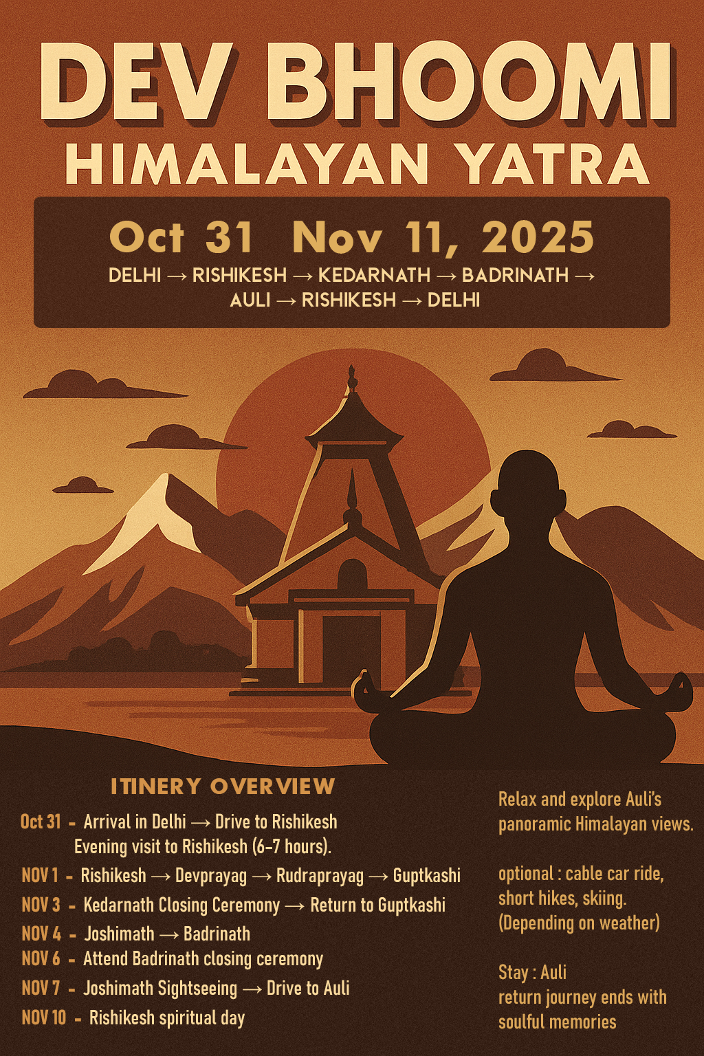 From the mystical Kedarnath to the highest Shiva temple at Tungnath, this yatra takes you across Chopta’s meadows, Joshimath’s ancient shrines, Auli’s snowy peaks, and the rare Bhavishya Badri temple. Witness the closing ceremonies at Kedarnath and Badrinath, trek to Chandrashila for Himalayan sunrise views, and experience the serene energy of Rishikesh on the banks of the Ganga.